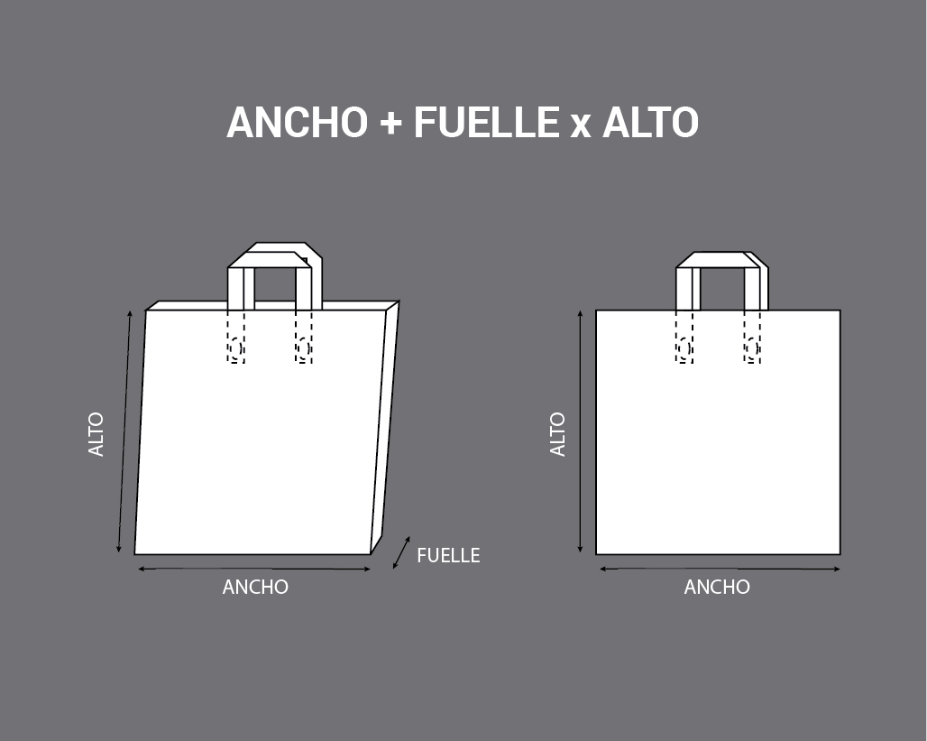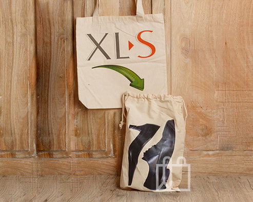 Bolsas fabricadas con algodón natural en tamaño estándar o a medida. Para el estampado utilizamos serigrafía con uno o dos colores por ambos lados de la bolsa. El asa de cinta es del mismo material.